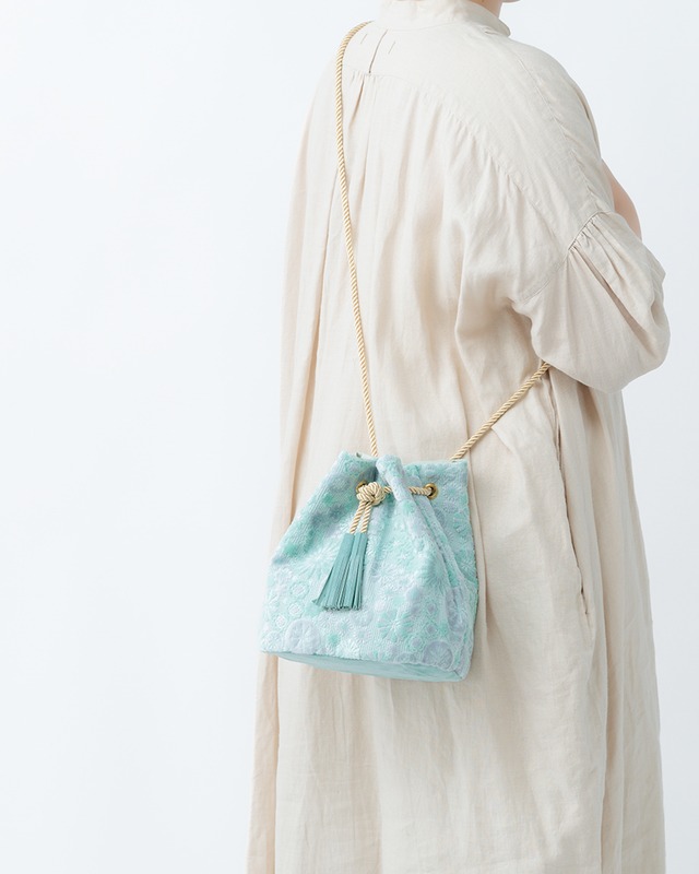 立体感のある織り模様が印象的なパイルジャカード織りの生地で作った、斜め掛けショルダーにもなる巾着バッグです。 ※ご注文後に仕上げ作業を行ってから発送いたします。 お届けまで【5〜7日程度】お時間を頂戴しております。 冬の朝 白い息 光の中できらめく 氷の花 雪華 ─せっか─ 雪の結晶を思わせる、フロスティな金華山織。 和歌山県・高野口産の金華山織を、別注のオリジナルカラーで染め上げました。 冬の氷をイメージした、やわらかなアイスブルーの巾着です。 実物は、透明感のあるラメ糸が織り込まれ、光の角度でキラリと表情が変わります⟡.· 金華山巾着は、 着こなしのポイントになる色柄、 コンパクトだけどお出かけに必要な最低限の荷物+αのモノがちゃんと入って、 巾着として持つだけでなく斜め掛けや肩掛けができる。 そんな、見た目と機能性を両立させました。 開閉はマグネットホックです。 大きな荷物がある時や、小さなお子さんと一緒のお出かけも、 斜め掛けにすれば両手があくので便利です。 サイズ 約タテ210×ヨコ220×マチ120mm 重量 約200g 持ち手長さ ショルダー時 約125cm、手持ち時 約60cm 素材 パイルジャカード織り(表地、組成は綿、ポリエステルなど)、裏地 綿ツイル、真鍮金具、マグネットホック、ヒモ(レーヨン) 底とタッセルは、日本製のピッグスキンを使用しています。 表地には、透明感のあるラメがほんのりと入っています。 色合いはアイスブルーと淡いパープルの組み合わせ。 機屋さんではキリコ柄と呼ばれるこの柄は、まるで雪の結晶のよう。 冷たいのに、どこかあたたかい印象です。 タッセルと底は水色、紐はベージュゴールドを合わせました。 主張しすぎないやさしい色合いは、コーディネートに取り入れやすく、 それでいて、ポイントにもなってくれる巾着です。 〜〜産地の生地 金華山織(きんかざんおり)について〜〜 和歌山県は高野山のふもとにある高野口はパイル織りの世界的な産地として知られています。 その中でも、複雑な模様を表現する『パイルジャカード織り(和名を地柄金華山)』はパイル織りの最高峰と言われています。 これまで国会議事堂の椅子や応接セットなどインテリア用途としても重宝されており、その丈夫さと耐久性はお墨付きです。 ふわもこ立体的な柄と独特の色合わせ。とても触り心地が良く、実物を見ると、思わず「かわいい!」と声に出してしまう生地なのです。 あなたにもぜひ、使うほどに愛着が増すこの金華山巾着の魅力を手に取ってご覧いただけたら嬉しいです(^^) ※撮影画像は、光の当たり具合やモニターの環境により色味が違って見える場合があります。あらかじめご了承ください。 ※切り替えに使用した革は、濡れたり擦れたりした場合など、色移りの可能性がございます。 ※送料を抑えるため、折りたたんでの発送となります。 ※お手元に届いた商品と、掲載されているものが、色味や柄の位置などが異なる場合がございます。1点ずつ丁寧に制作しております。柄の出方の指定などは承っておりません。 ※製品の特性上、初期不良以外のクレーム・返品はお受けできませんので、何卒ご了承ください。