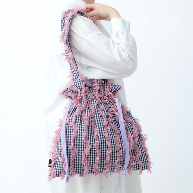 巾着の形をした、肩掛けのトートバッグです。 日常に馴染むサイズ感で、軽やかに持てるよう仕立てました。 ※ご注文から 2〜4日以内 に発送いたします。 発送が完了しましたら、追跡番号などをメールにてお知らせいたします。 肩掛けOKの巾着トート。 そのまま使えば A4ファイルや13インチPC もラクラク入る収納力があり、巾着の口をキュッと絞ると、コンパクトなサイズ感で持ち歩けます。 軽い巾着トートは、荷物をポンポン放り込んで、日常のお出かけに気軽に使えるのが魅力。 メインバッグとしても、サブバッグとしても活躍します。 こちらのピンクのカットジャカード生地は、 群馬県桐生の機屋さんにカラー別注したオリジナル生地になります。 ギンガムチェックにリズミカルなフサフサが並びます。 持ち手を肩に掛けると、フサフサがアクセサリーのようになるのもポイントです。 サイズ 約タテ41 × ヨコ40cm 持ち手長さ 約62cm 素材 表地:綿、ポリエステル 裏地:コットン ひも:ポリエステル スマートフォンや鍵などを入れられる、仕切り付きの内ポケットが付いています。 裏地はピンク感のあるパープルカラーです。 イベントや実店舗ポップアップでもご好評いただいているこちら。 毎日のお出かけにいろどりと手触りの楽しさをぜひ。 ※クリックポスト(追跡付き/ポスト投函/2〜4日後着)での発送となります。 ※沖縄のみ、発送から到着まで 1週間〜10日前後 かかります。 ※日時指定をご希望の場合は、発送方法の「宅急便コンパクト(全国一律490円)」を選択してください。 ※撮影画像は、光の当たり具合やモニター環境により、色味が異なって見える場合があります。 ※繊細な生地のため、お洋服などの金具による引っ掛けにご注意ください。 ※お手元に届いた商品と、掲載画像では色味や柄の位置が異なる場合があります。1点ずつ丁寧に制作しているため、柄の出方の指定は承っておりません。 ※アイロンをかける際は、あて布をして中低温でお願いいたします。 ※お洗濯は手洗い、またはネットに入れておしゃれ着モードで行ってください。 ※製品の特性上、初期不良以外のクレーム・返品はお受けできません。ご了承ください。