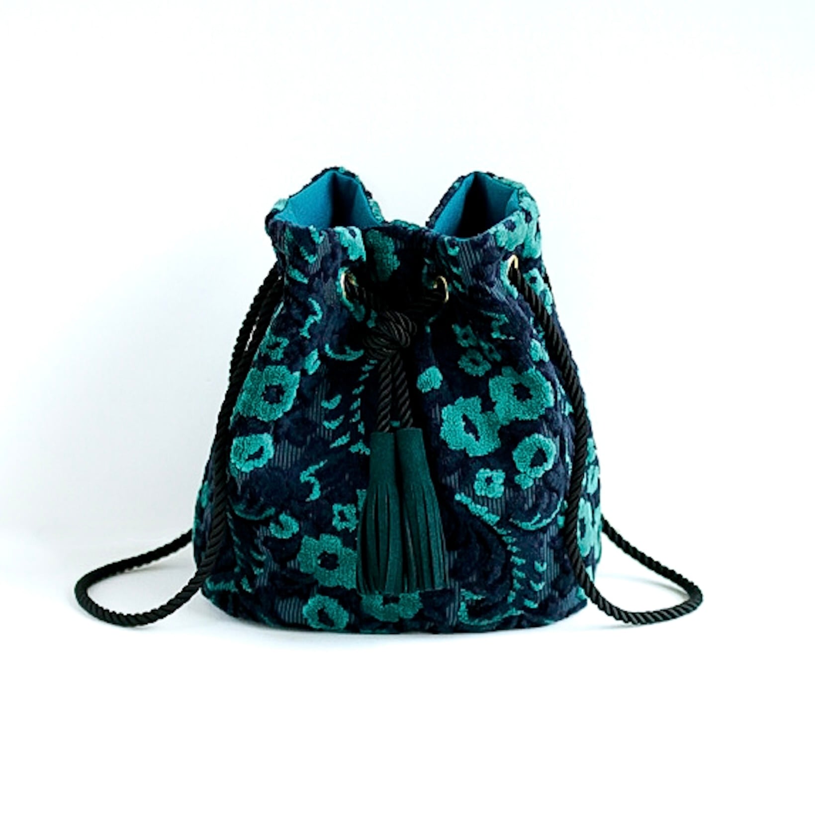 表地は濃紺とエメラルドグリーンの花柄、チラ見えの裏地は青緑、底とタッセルは深緑のピッグスキン、紐はブラックです。