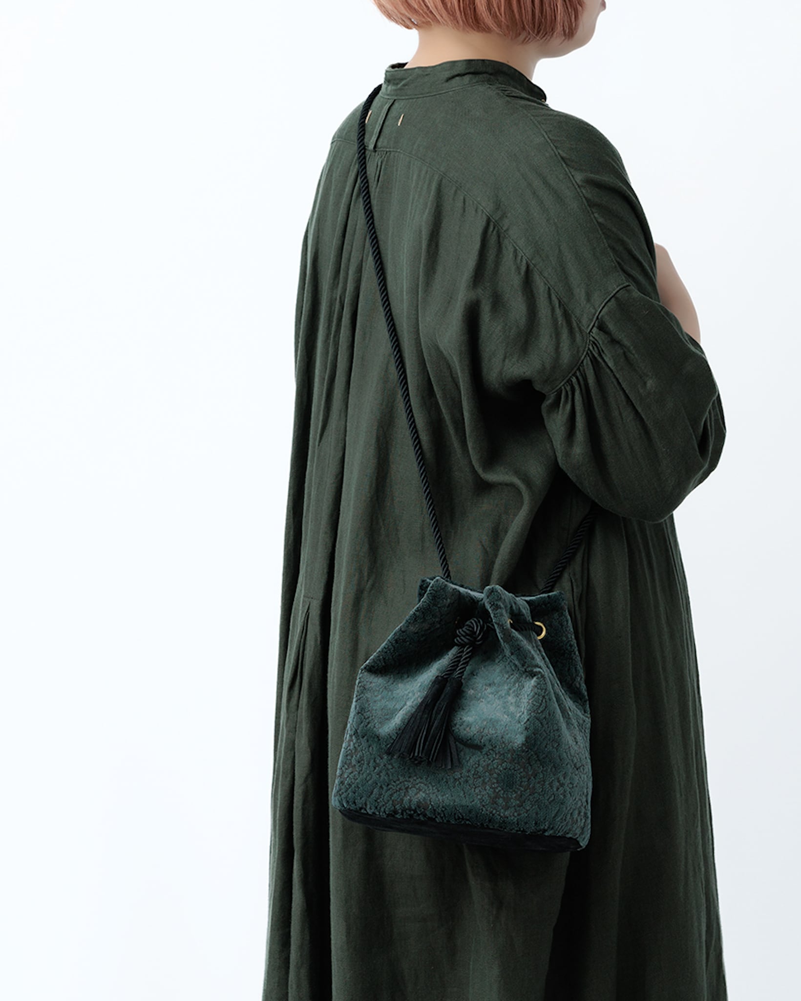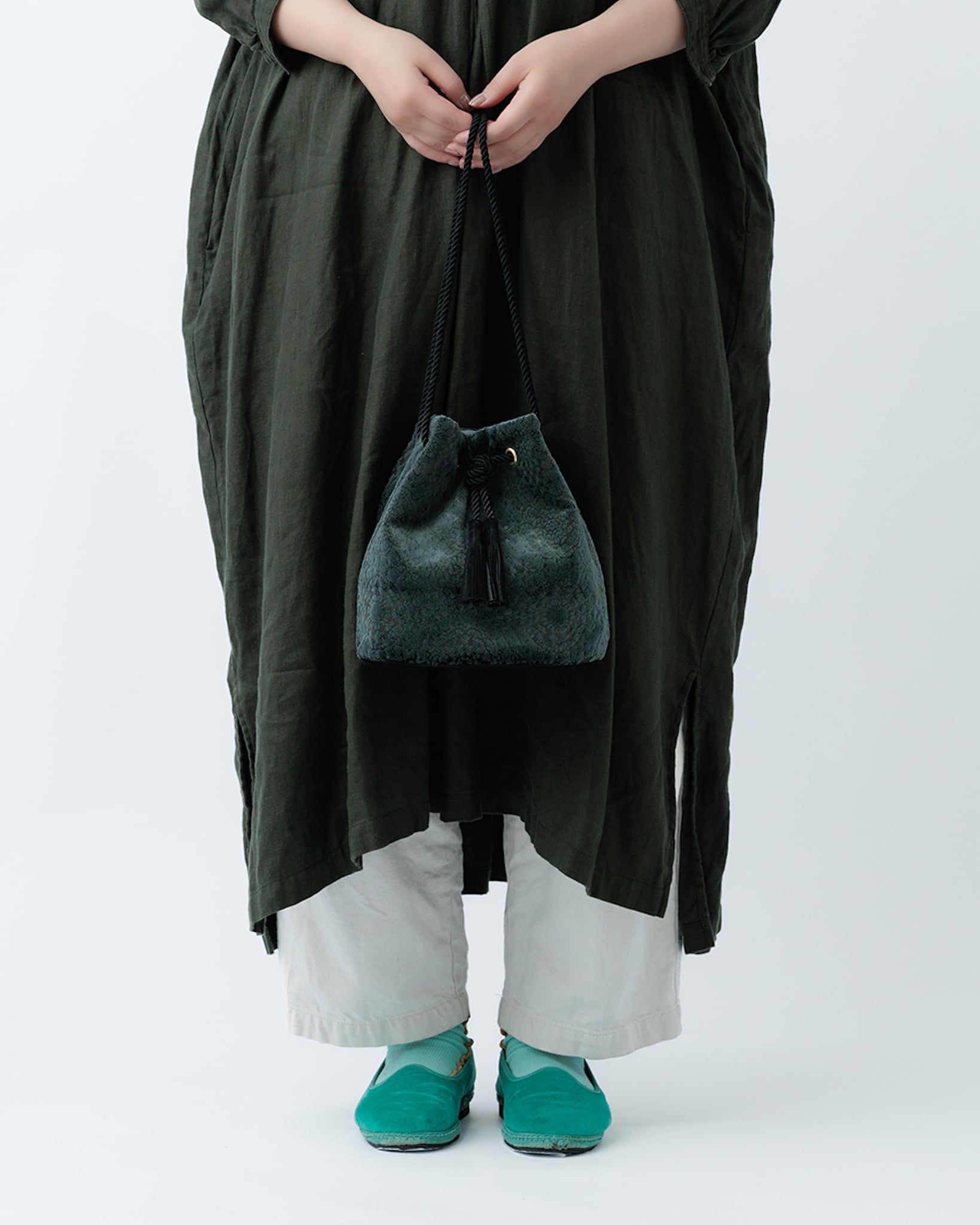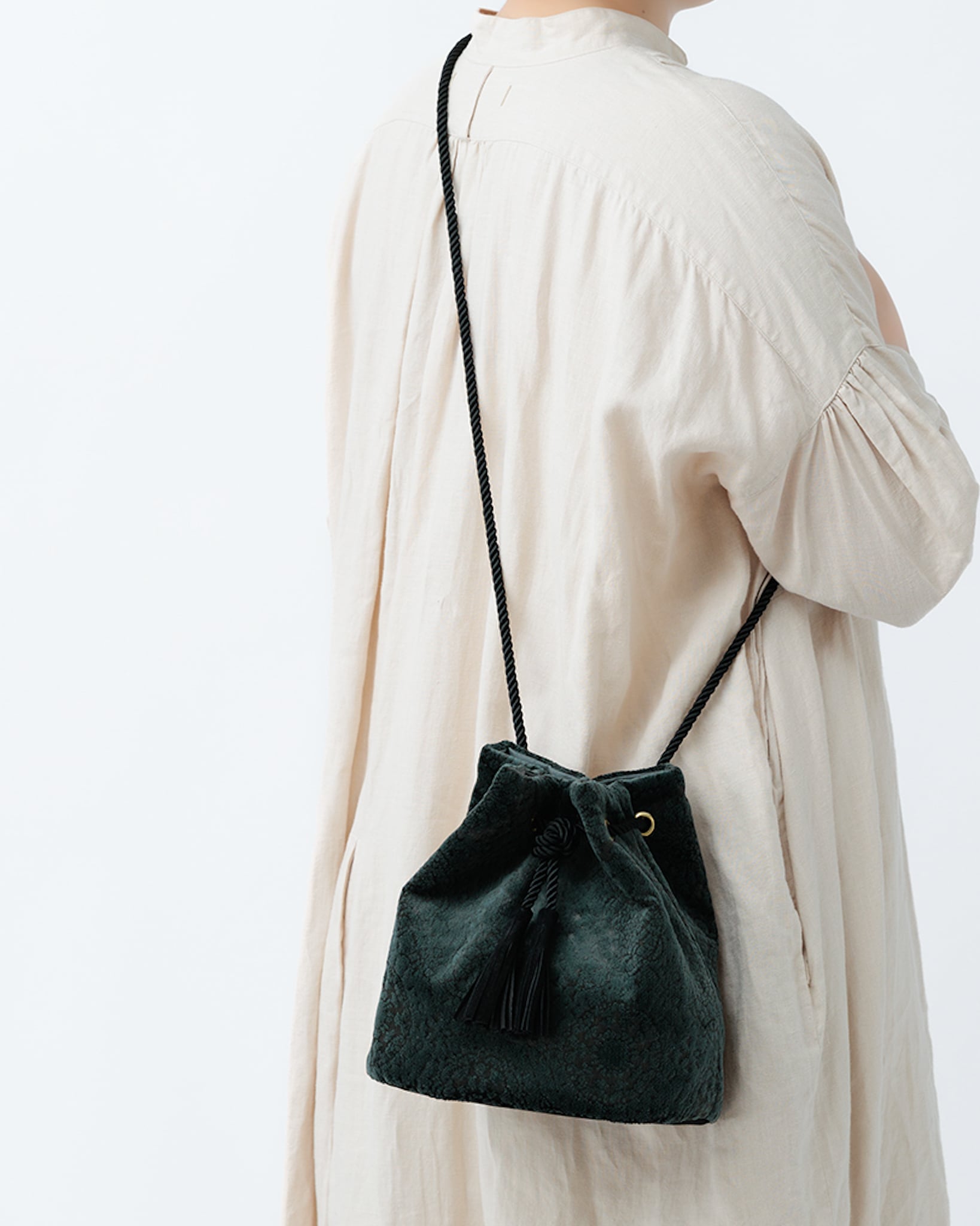巾着として持つだけでなく斜め掛けや肩掛けができる。