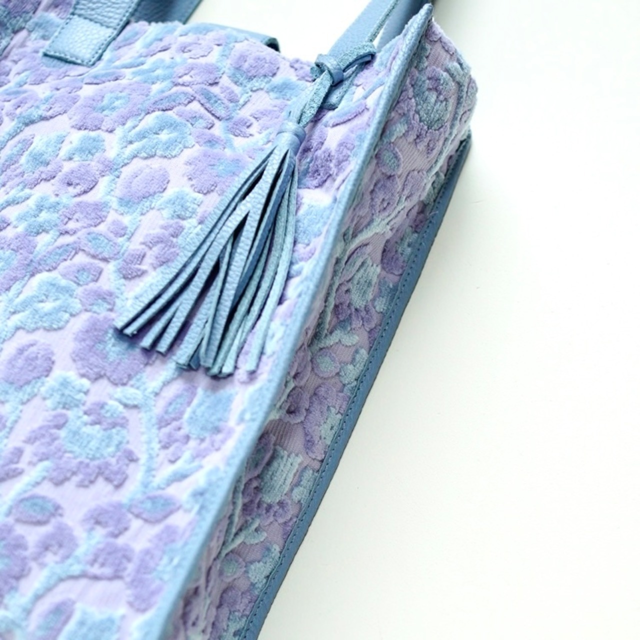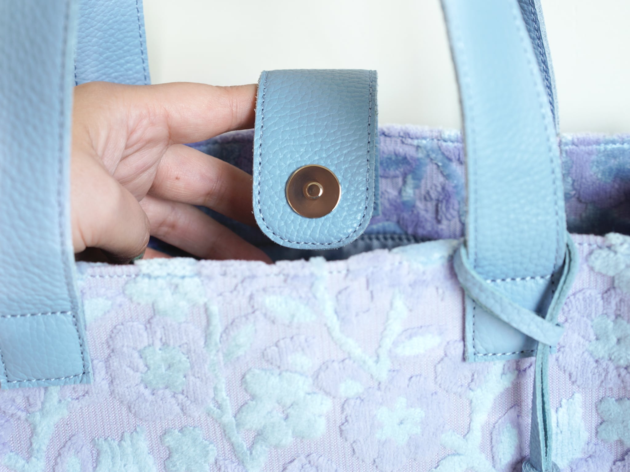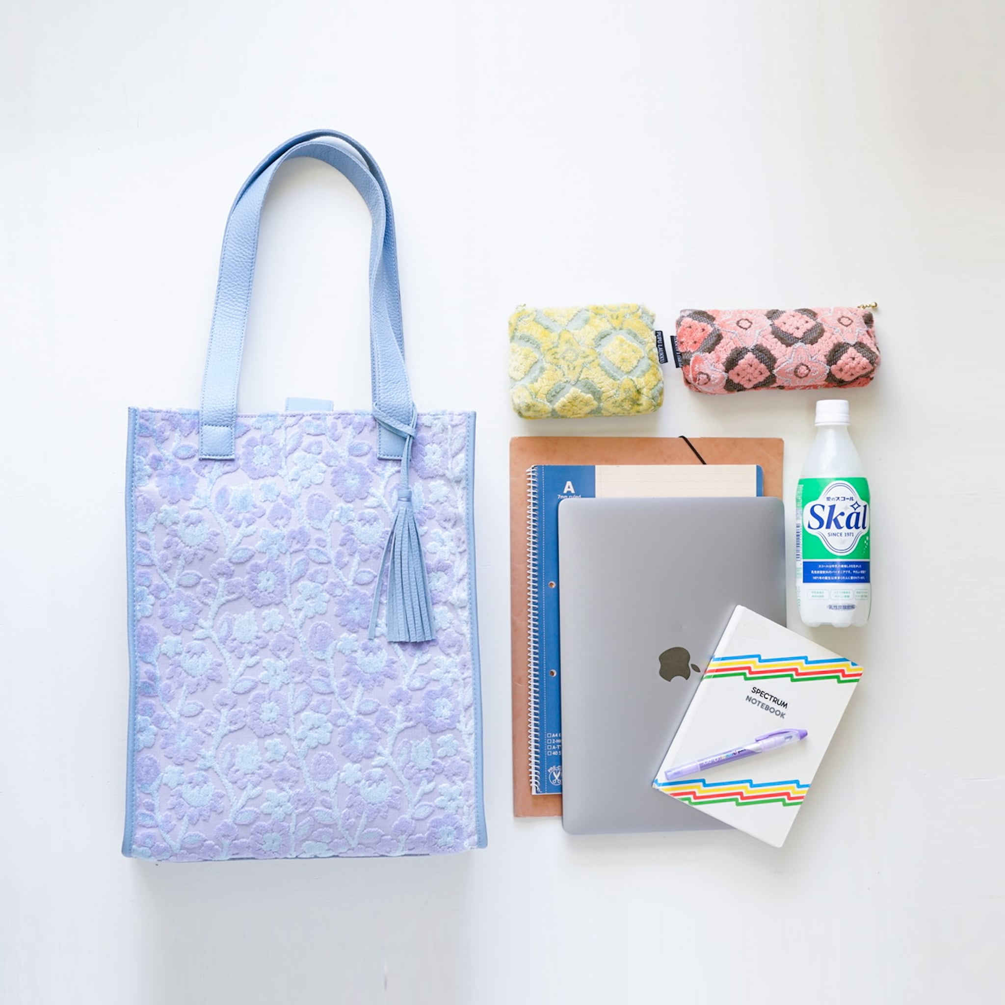 素材 パイルジャカード織り(表地、組成は綿、ポリエステルなど)、ナイロン(裏地、グレーカラー)、マグネットホック、牛革(持ち手・パイピング・底・タッセル)