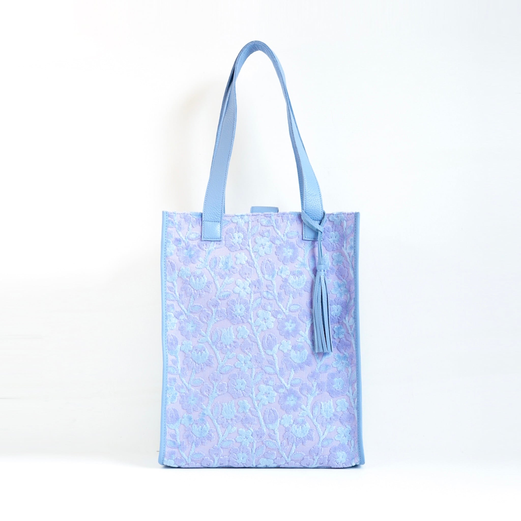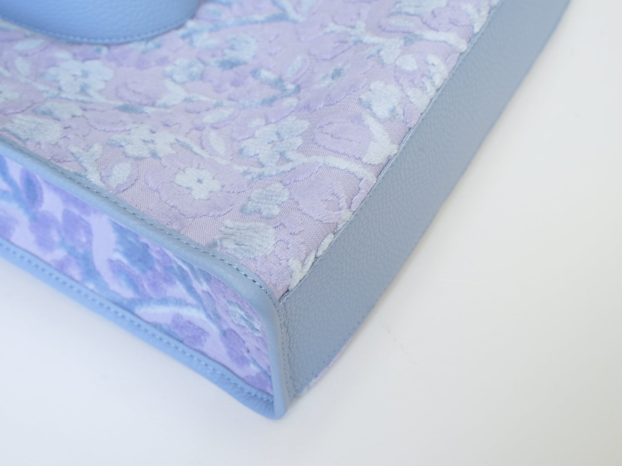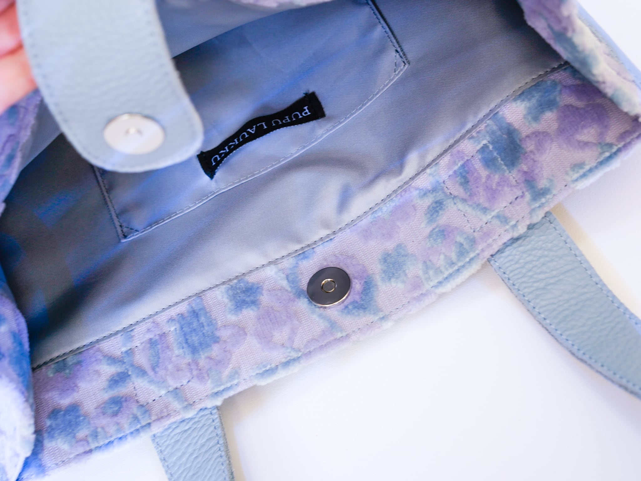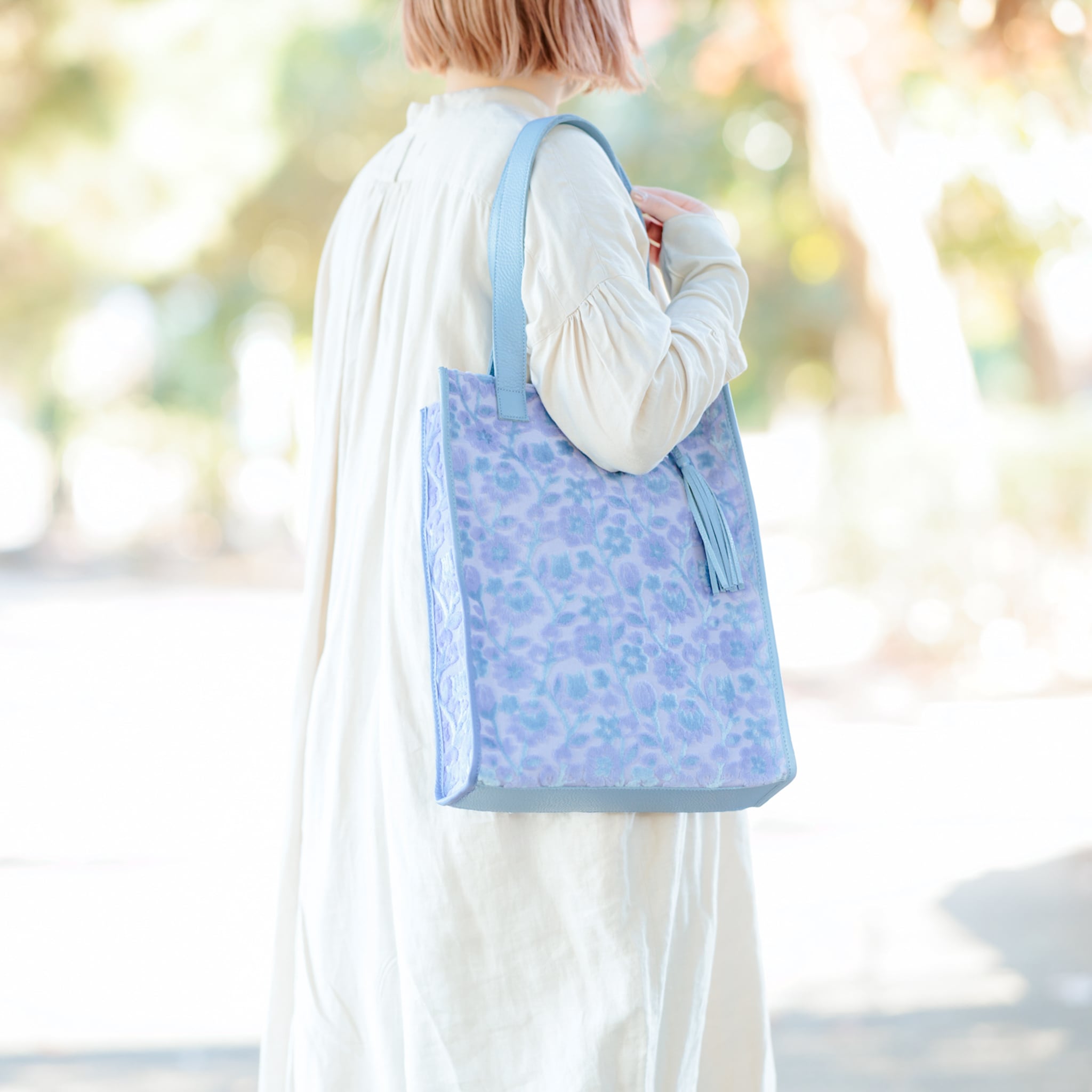 素材 パイルジャカード織り(表地、組成は綿、ポリエステルなど)、ナイロン(裏地、グレーカラー)、マグネットホック、牛革(持ち手・パイピング・底・タッセル)