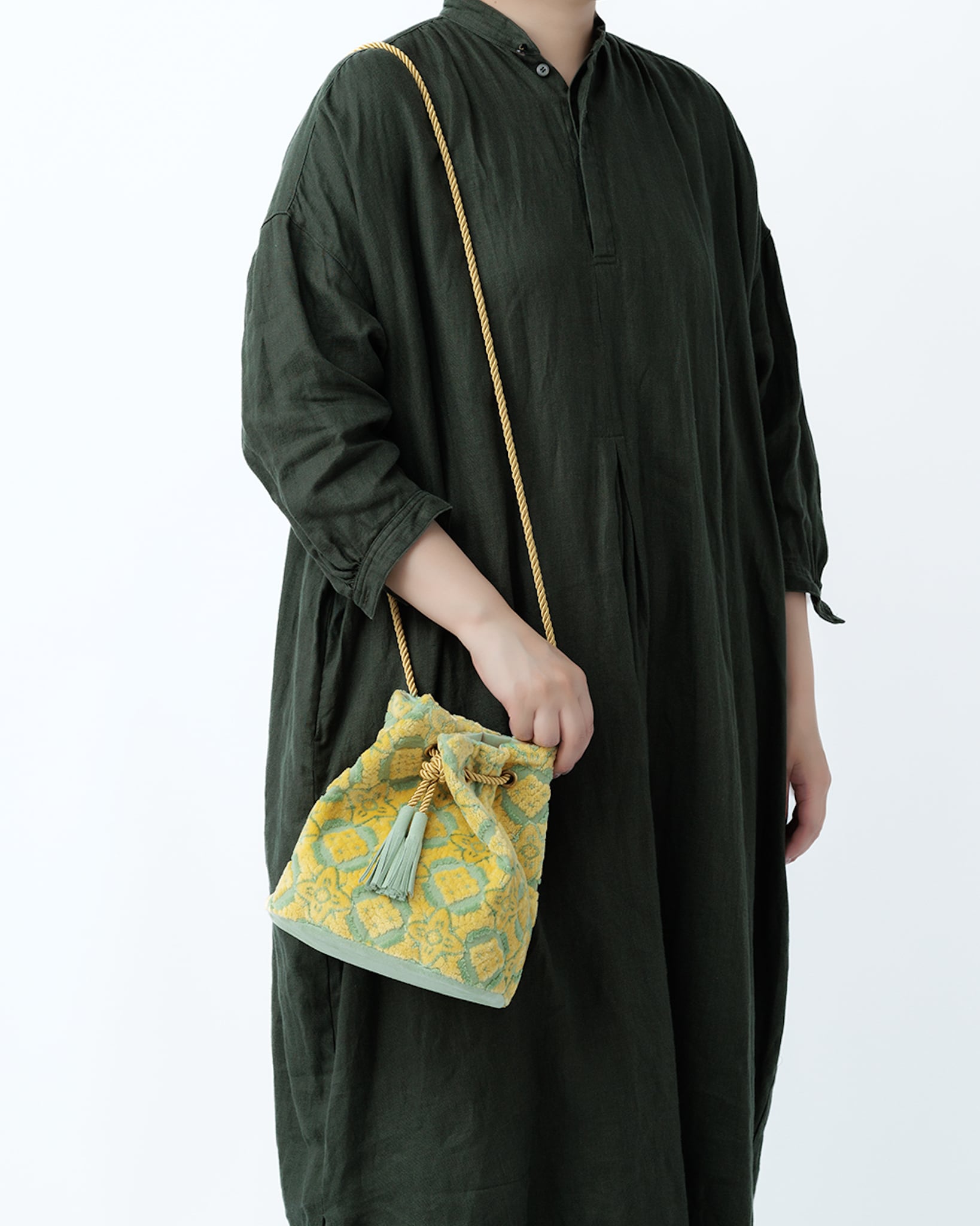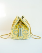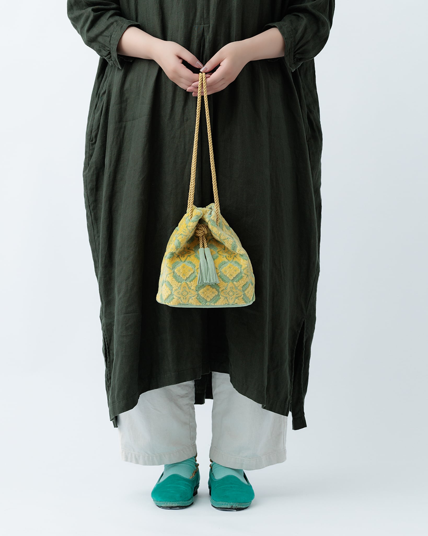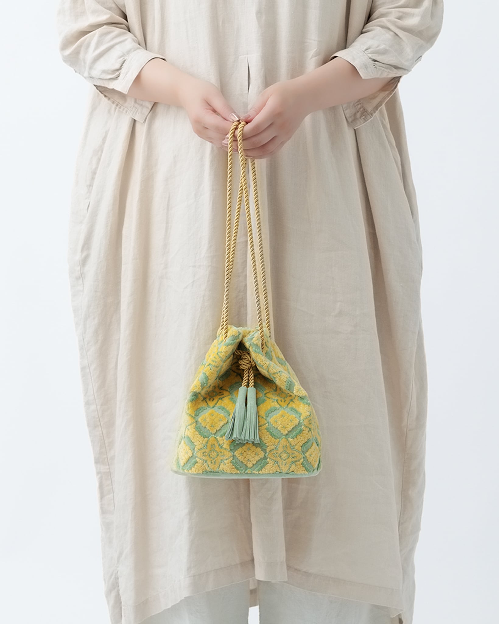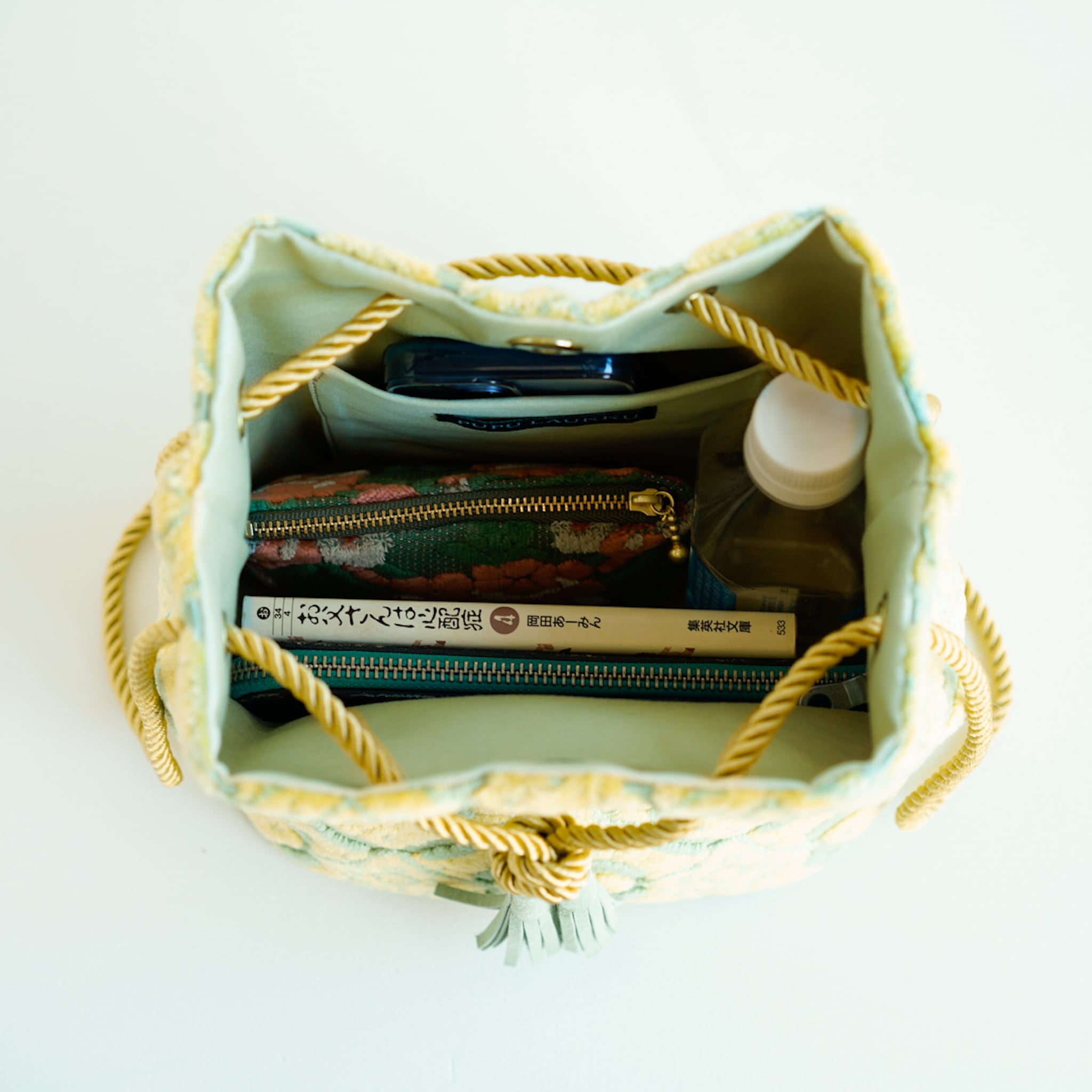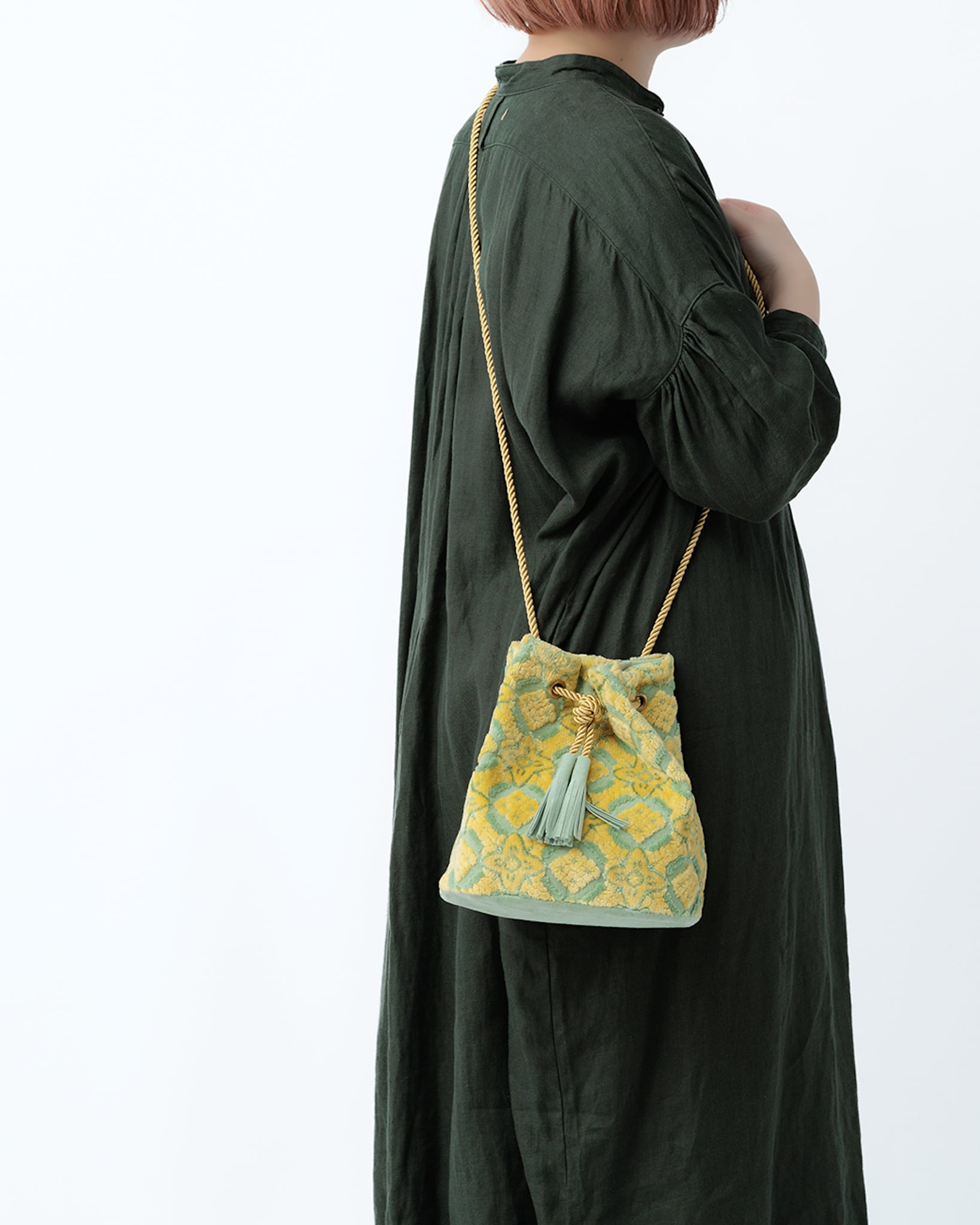 裏地は淡い若草色、底とタッセルは明るさのある黄緑のスエード、紐は光沢のあるイエローゴールドを合わせています。