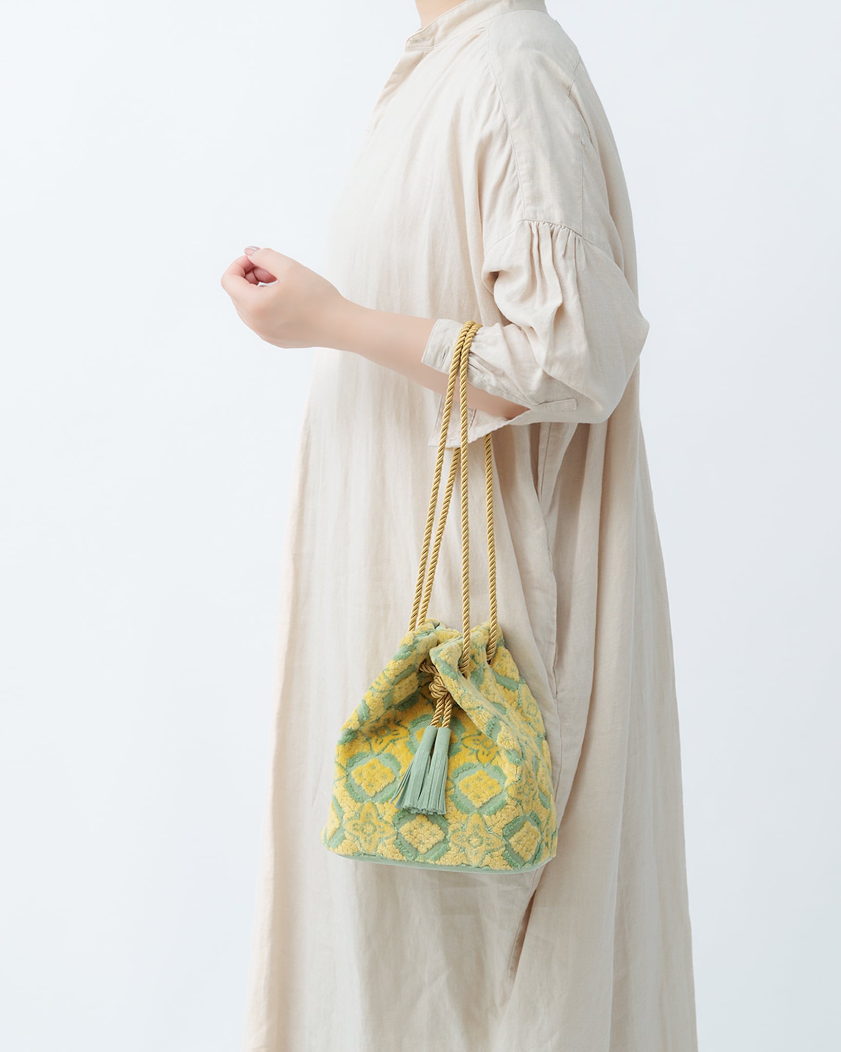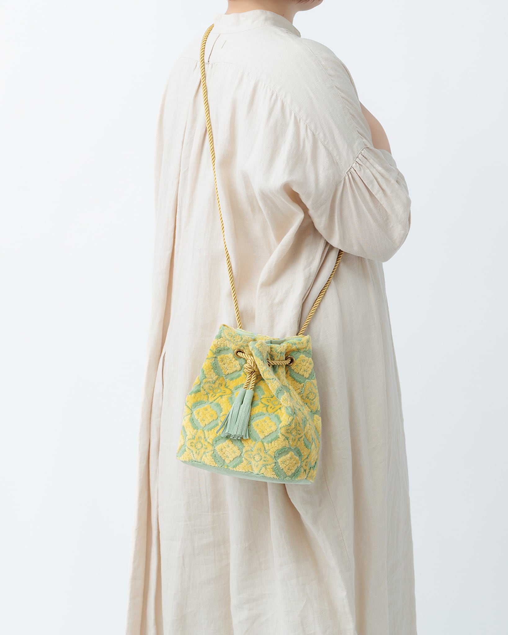 立体感のある織り模様が印象的なパイルジャカード織りの生地で作った、斜め掛けショルダーにもなる巾着バッグです。