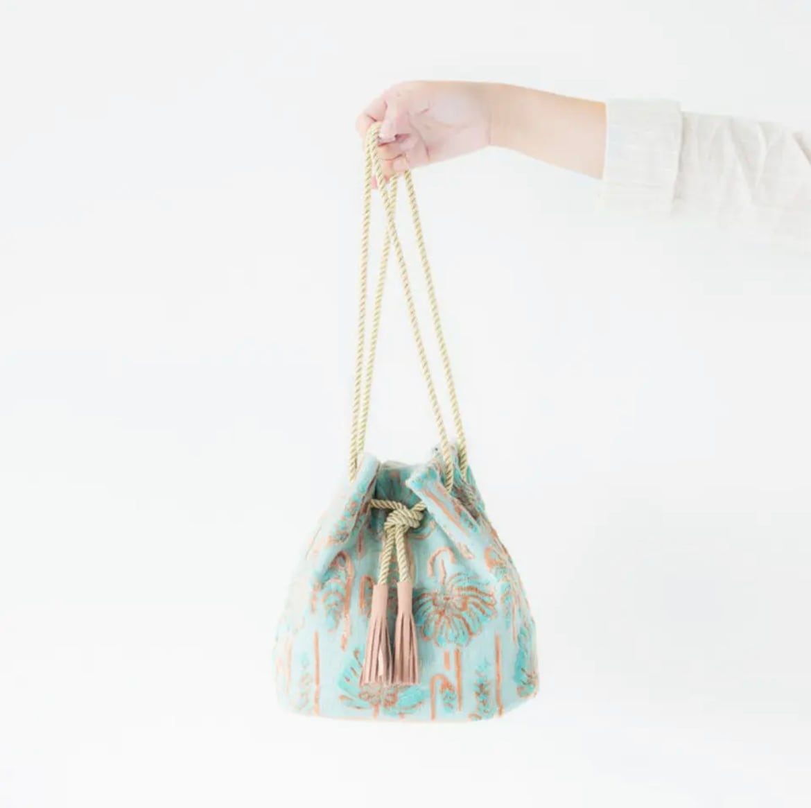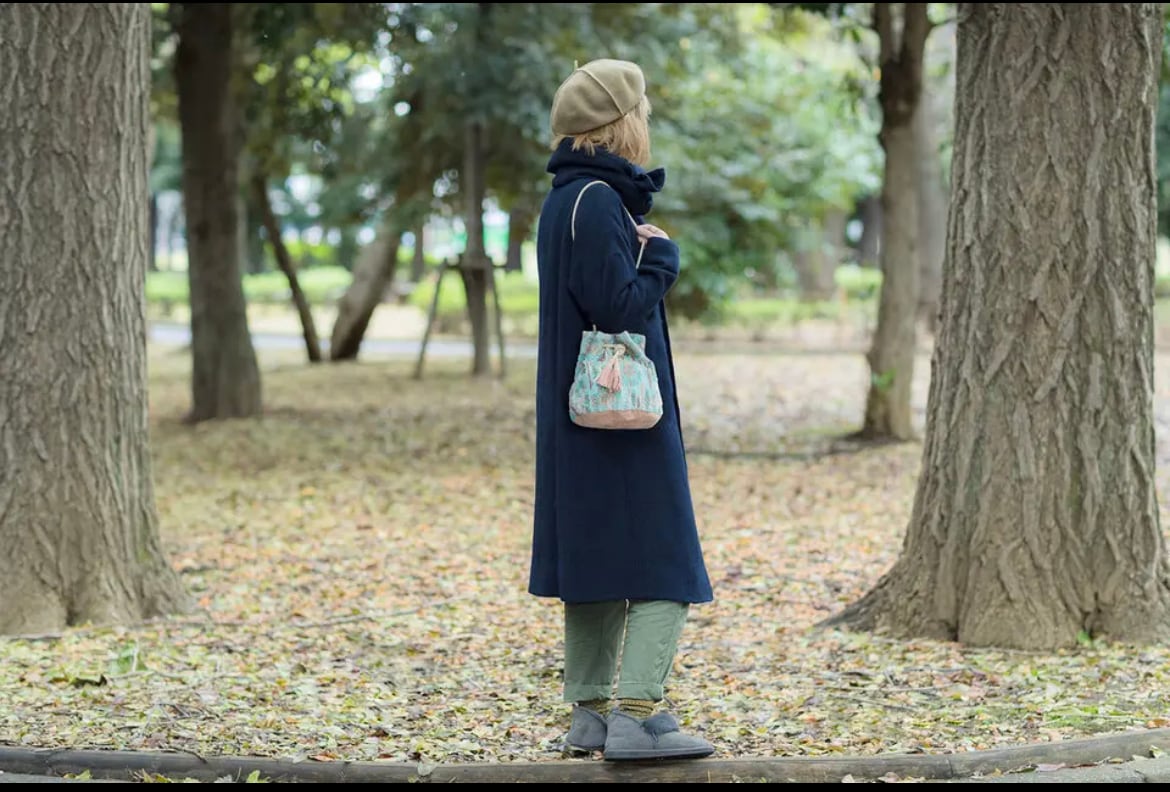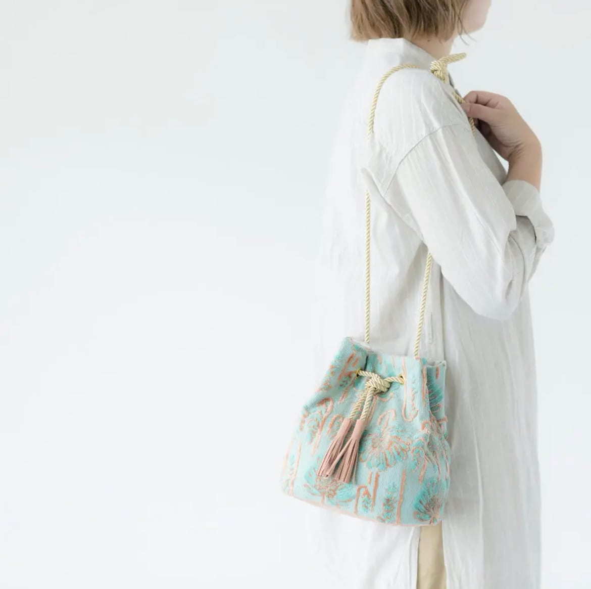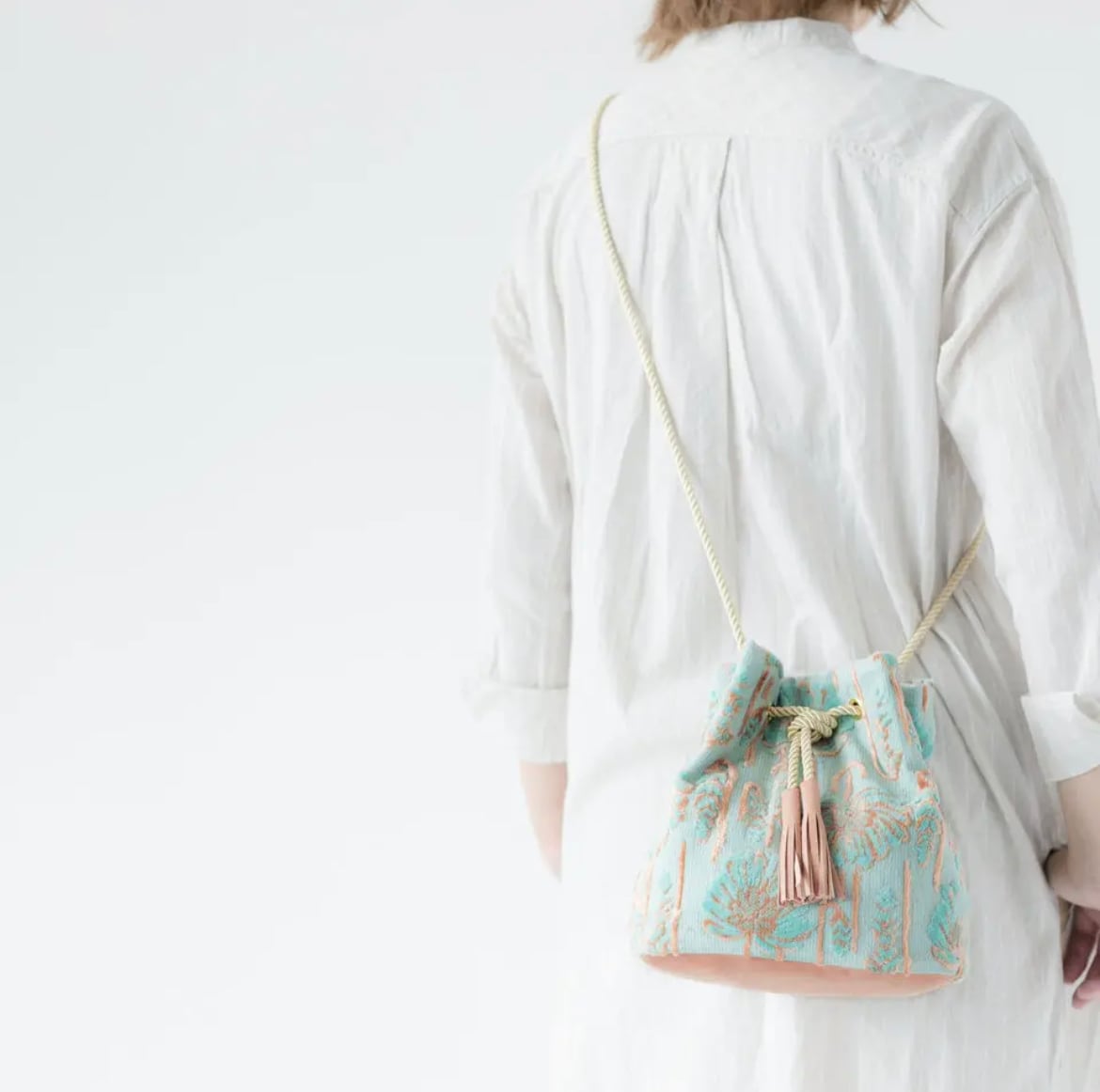 着こなしのポイントになる色柄、コンパクトだけどお出かけに必要な最低限の荷物+αのモノがちゃんと入って、巾着として持つだけでなく斜め掛けや肩掛けができる。