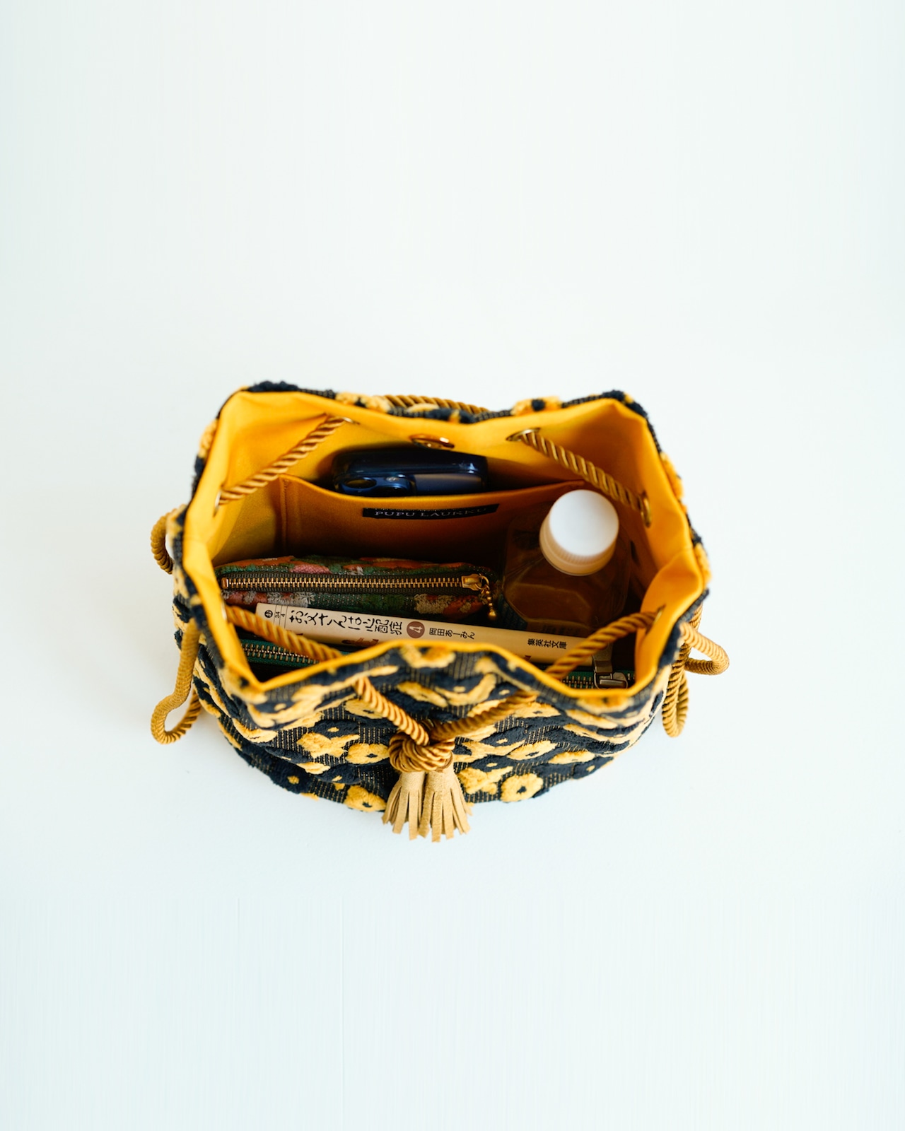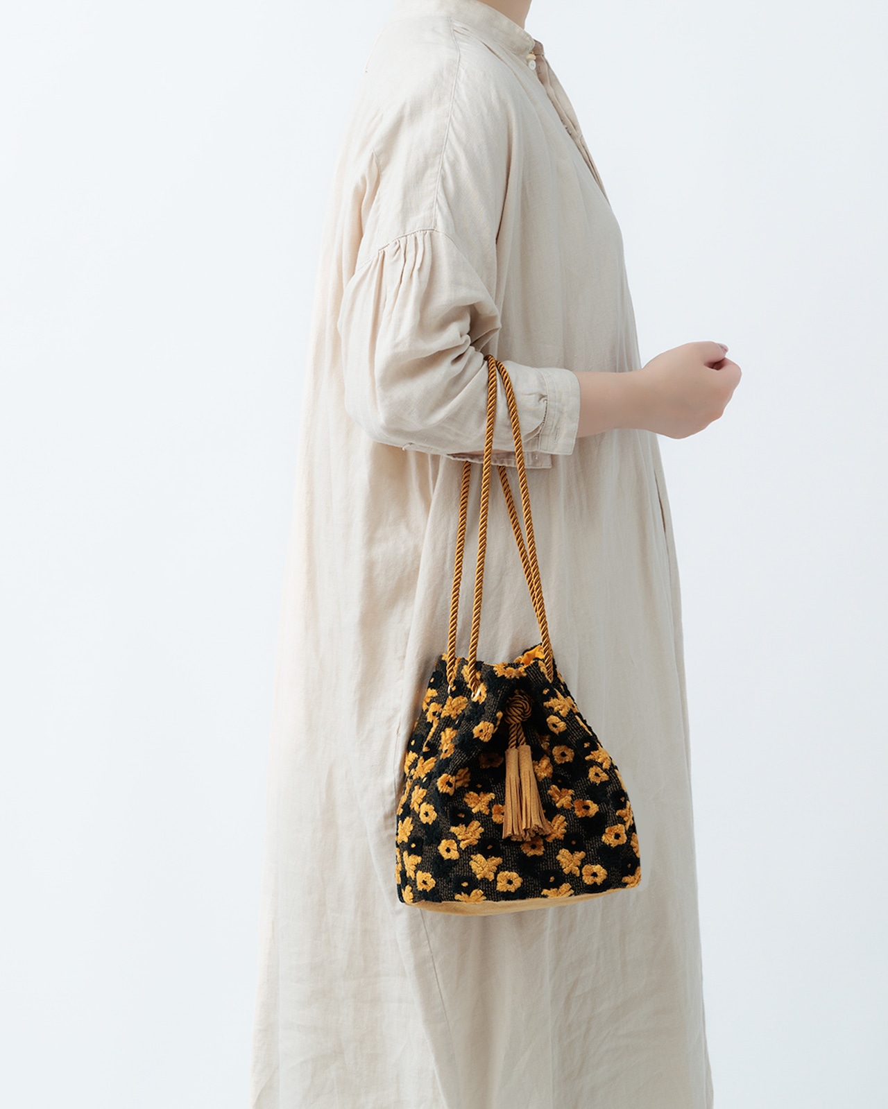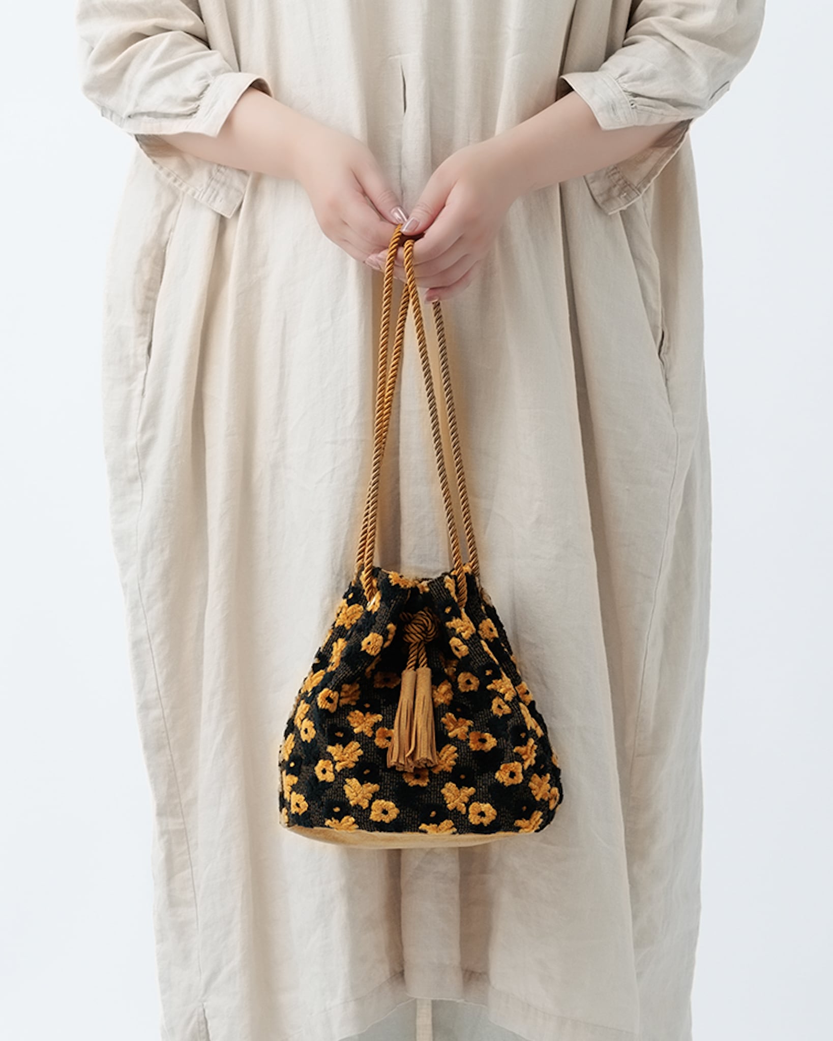 小花柄のオレンジは、まさに黄金色(こがねいろ)といった雰囲気。そんな小さめの花柄が黒地によく映える、どこかモダンな印象の大人かわいい巾着バッグです。
