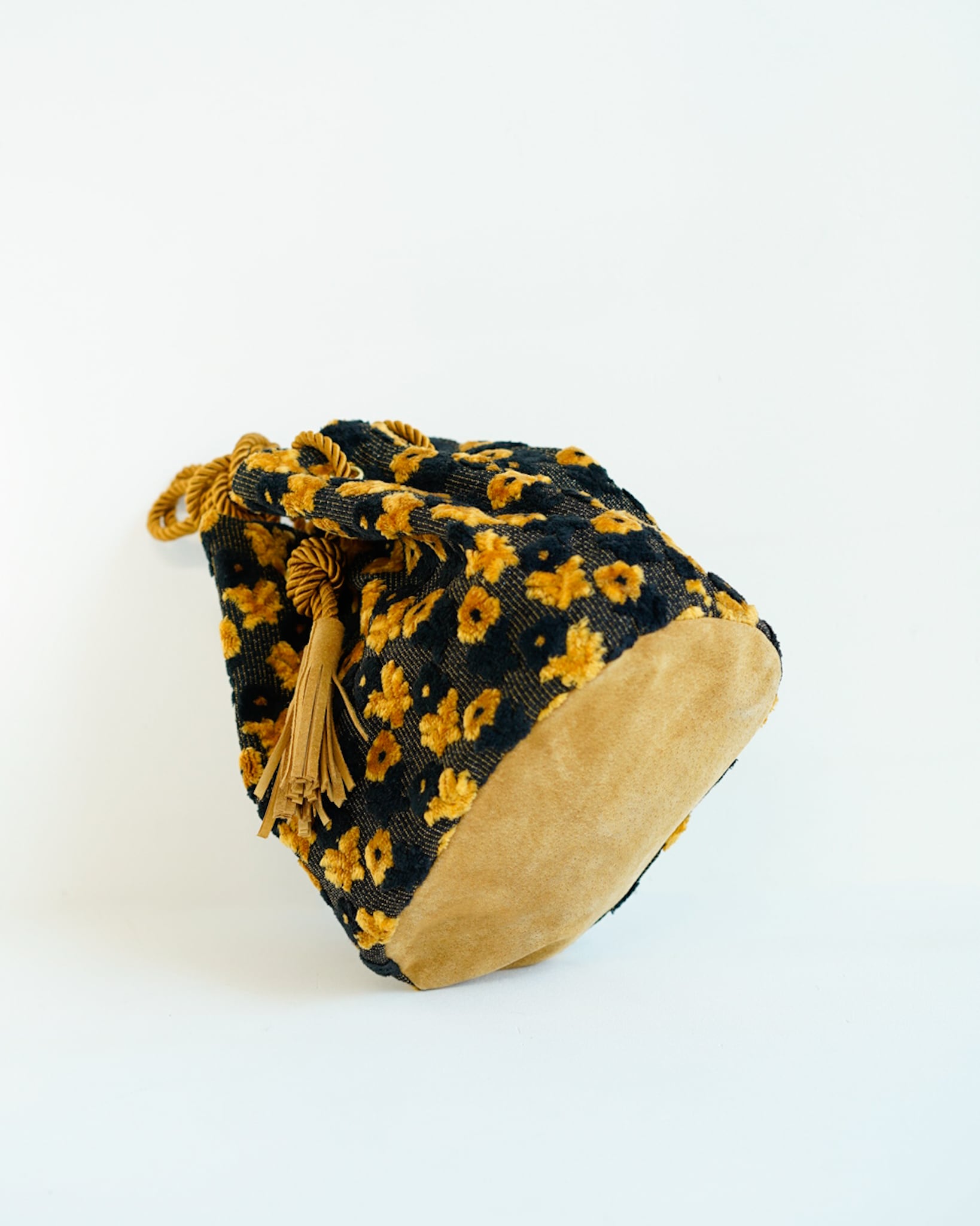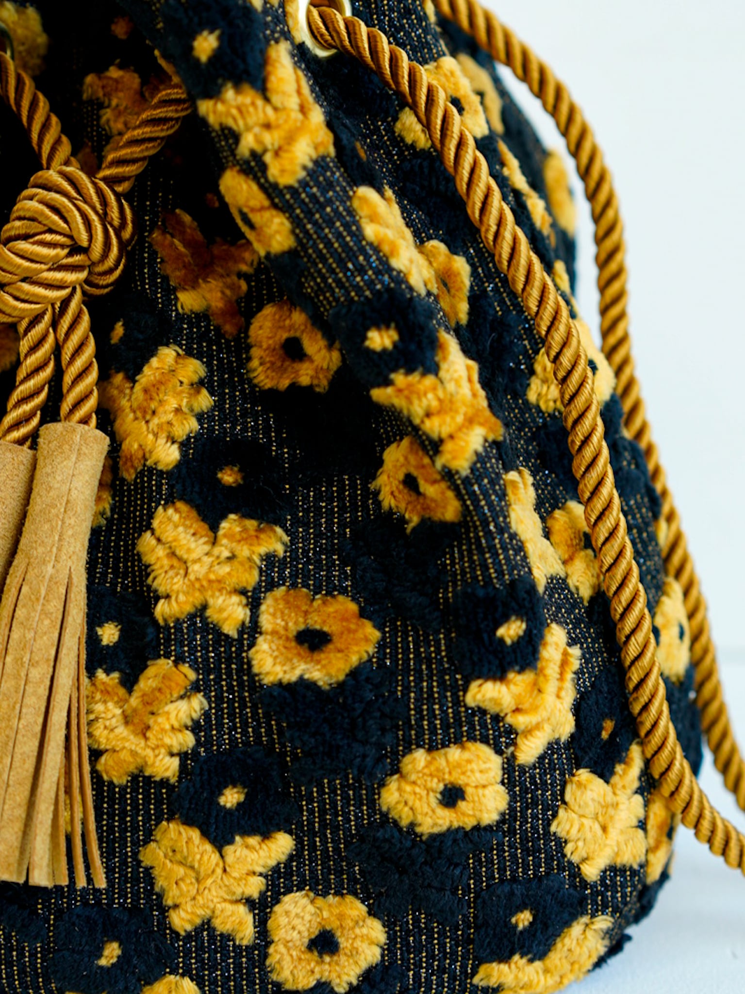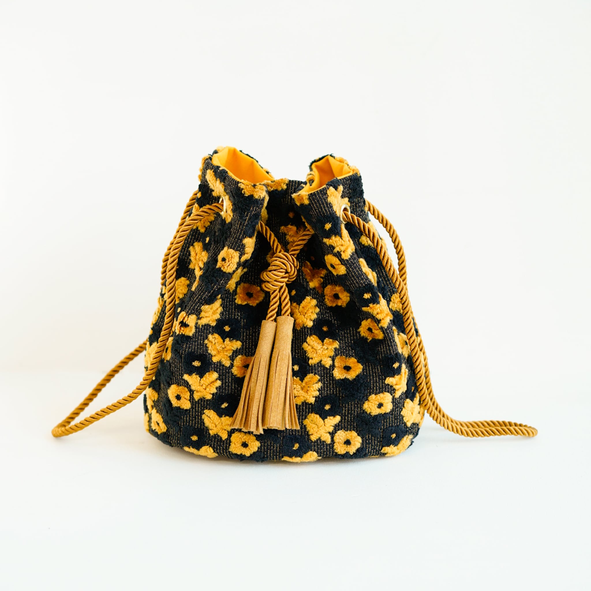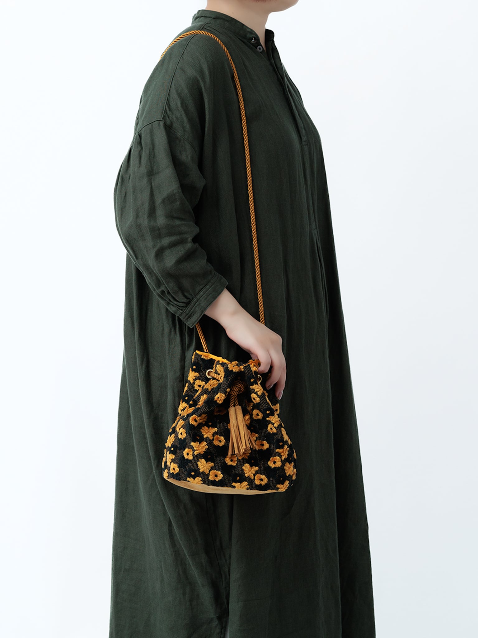 小花柄のオレンジは、まさに黄金色(こがねいろ)といった雰囲気。そんな小さめの花柄が黒地によく映える、どこかモダンな印象の大人かわいい巾着バッグです。
