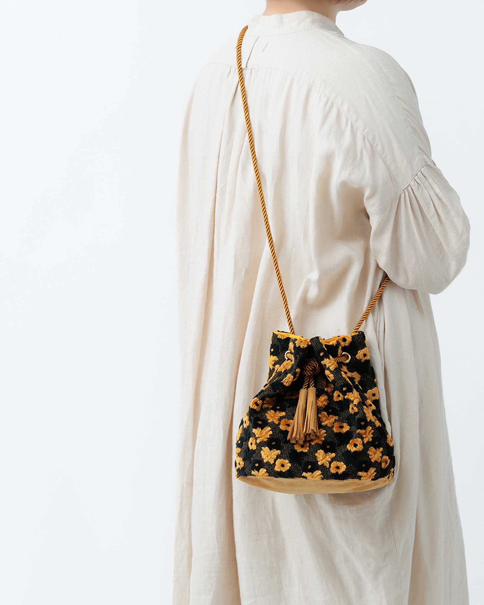 立体感のある織り模様が印象的なパイルジャカード織りの生地で作った、斜め掛けショルダーにもなる巾着バッグです。