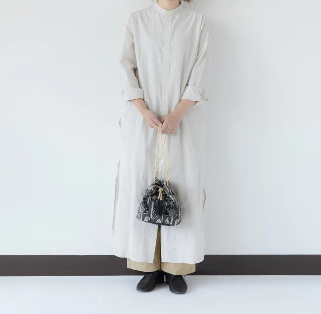 着こなしのポイントになる色柄、コンパクトだけどお出かけに必要な最低限の荷物+αのモノがちゃんと入って、巾着として持つだけでなく斜め掛けや肩掛けができる。